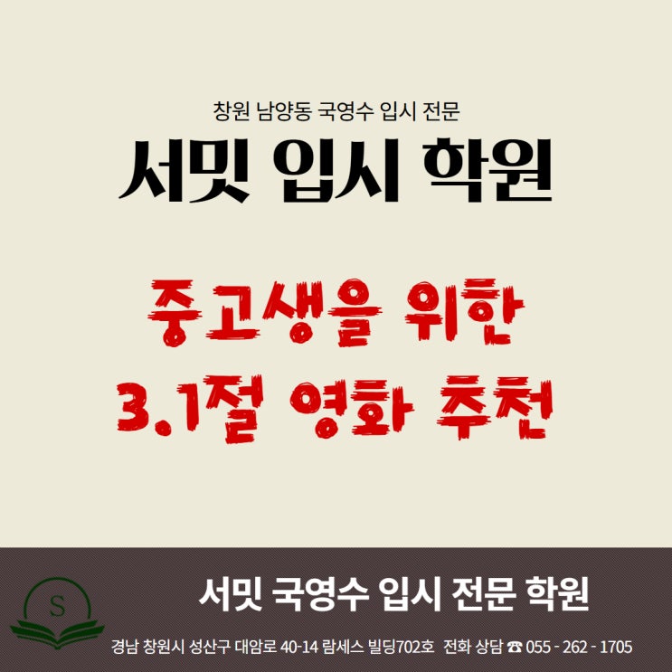 중고생을 위한 삼일절 영화 추천 창원 남양동 중·고등학생이 꼭 한 번은 봐야 할 작품들 3월이 되면 학교에서는 3.1절 계기교육이 진행되고, 역사 수업 시간에도 일제강점기와 독립운동에 대한 내용이 비중 있게 다뤄집니다. 하지만 교과서 속 활자만으로는 그 시대의 분위기와 인물들의 선택을 온전히 느끼기 어렵습니다. 특히 사파중, 대방중, 삼정자중, 안남중, 신월중 학생들처럼 중등 시기에 역사적 사건을 배우는 학생들은 ‘사건의 흐름’뿐 아니라 ‘그 안에 있었던 사람들’을 이해하는 과정이 중요합니다. 그래서 오늘은 중1부터 고3까지 함께 볼 수 있는 삼일절 관련 영화들을 정리해 보았습니다. 단순한 감상이 아니라, 역사 이해력....... <img src="https://blogthumb.pstatic.net/MjAyNjAyMjdfMjgw/MDAxNzcyMTE4NjQzODIx.SYBrgMu_EC_5vvlxGvM2ZCqjo5H1NoSjOlSSk5D7v6Qg.R9m3fmU0CJe77-UhHXV1XagDn1KvNYouMhsdSuH6kR0g.JPEG/%BC%AD%B9%D4_%C1%DF%B5%EE%BA%CE_%B8%F0%C1%FD_%2842%29.jpg?type=s3" />
