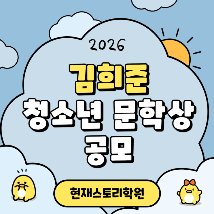 안녕하세요! 문예창작, 극작, 웹소설, 영화 입시전문 - 현재스토리학원 입니다. 오늘은 백일장에서 상받고 문창과에 합격할수 있는 청소년 문학상, 청소년 백일장 하나를 소개하려고 합니다. 공모전에서 상을 받으면 문예창작학과에 특기자 전형으로 입학할 수 있답니다. 제5회 김희준청소년문학상 공모 정보! (2026) 바로 제5회 김희준청소년문학상 입니다. 해당 공모전은 현장 백일장이 아닌 인터넷 접수로 이루어지는 공모전이기 때문에 현장까지 가야한다는 부담감도 없고 미리미리 글을 써서 몇번씩 수정해보고 공모에 참여해볼 수 있기에 여러가지 좋은 점들이 많답니다. 제5회 김희준청소년문학상 공모 정보! (2026) 많은 청소년 문학상, ....... <img src="https://blogthumb.pstatic.net/MjAyNjAyMDNfMTUg/MDAxNzcwMTE1ODMwNTk5.pK5Wf4U1qyz8nQ0iubJIOPk9Y5p6wkzuFi3ikSTupYEg.pOzGNf7GcJMWvvZdZOiNb26T8ujLOZarzre0ekZMAEQg.PNG/%B0%F8%B8%F0%C0%FC-006.png?type=s3" />