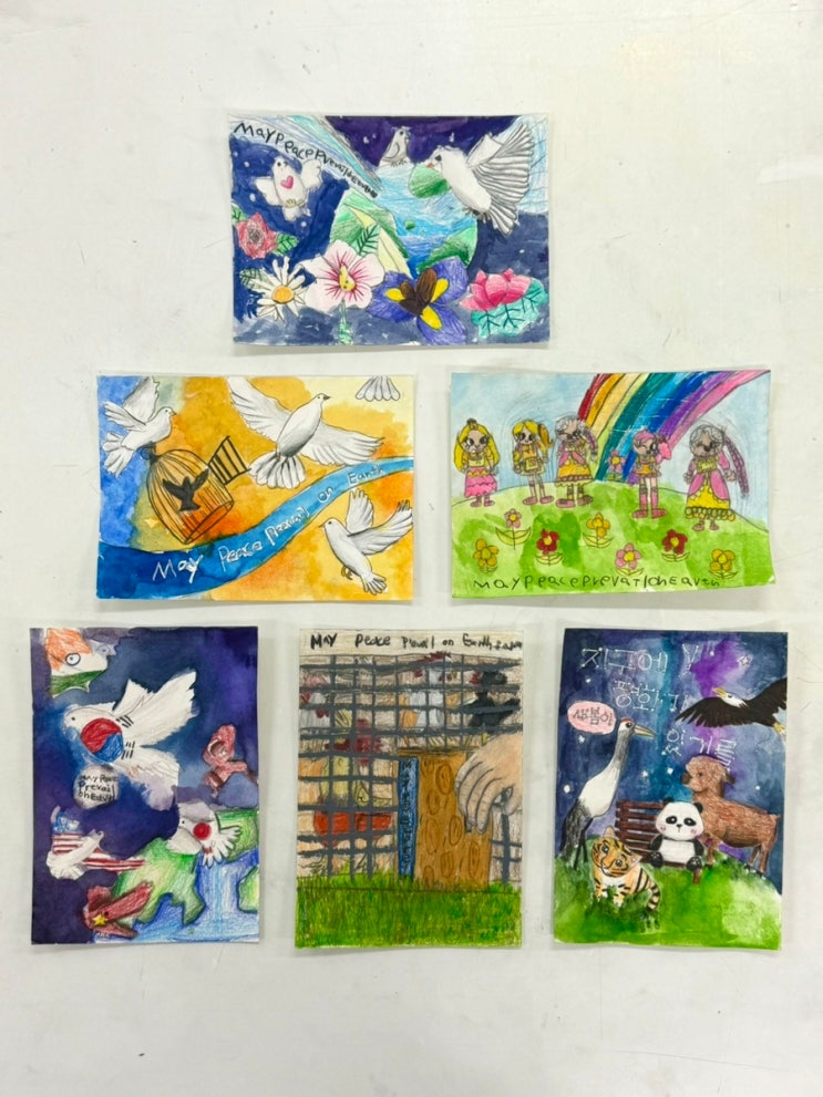 안녕하세요 상상팔레트 미술교습소입니다 96회 세계아동미술대회 최우수상/우수상 수상한 친구들은 국제교류전 출품 기회를 얻어 미국으로 작품을 출품해보게 되었어요! 6명의 친구들이 출품했고, 작품 주제는 "FREEDOM(자유)"로 작품 내에 디자인의 일부로 'May Peace Prevail On Earth(지구의 평화가 있기를)'이라는 평화의 메세지를 담아야했습니다! 작품 크기는 7*5인치로 작은 엽서 크기여서 작은 종이에 표현해보는거라 또 색다른 경험이었답니다! 평화로운 무지개 꽃밭 위에서 행복한 다국적 소녀들 6세임에도 엄청 꼼꼼한 스케치와 형태력이 돋보이는 작품이에요! 평화의 상징 비둘기와 다양한 국가를 대표....... <img src="https://blogthumb.pstatic.net/MjAyNTA4MjlfMjM3/MDAxNzU2NDUwOTE1MzA4.EohoNGH59nk90bg5GlrWc5-6D7fb7AtMbpP4t6IYfewg.F3k11T_65G8FDT7B1mMTaM7RFinBfpQaAv4gu5W2-XYg.JPEG/IMG%A3%DF3034.jpg?type=s3" />