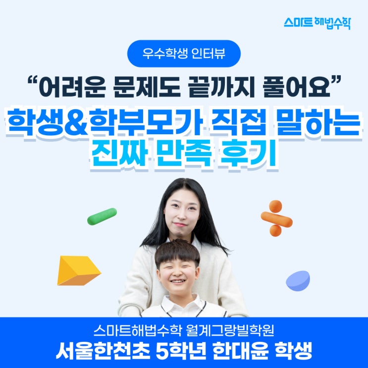 "어려운 문제도 끝까지 풀어요” 학생과 학부모가 직접 말하는 진짜 만족 후기 학원을 고를 때 가장 믿을 수 있는 건 결국 학생과 학부모의 실제 이야기 아닐까요? 오늘은 스마트해법수학 월계수학학원에 다니는 학생과 학부모의 생생한 후기를 소개합니다. 어려운 문제도 끝까지 해보면, 결국 풀려요 대윤이는 수학을 “재밌는 과목”이라고 말합니다. 예전에는 단순 연산만 반복해서 지루했지만, 지금은 생각하는 수학을 하면서 공부가 훨씬 즐거워졌다고 합니다. “문제를 어떻게 풀지 계속 생각하다가 혼자 힘으로 답을 찾으면 진짜 제 것이 된 느낌이에요. 그래서 더 재밌어요.” 특히 마음에 드는 수업은 서술형 수업. 칠판에 풀이 과....... <img src="https://blogthumb.pstatic.net/MjAyNjAyMjZfMjMw/MDAxNzcyMDY4Njk4NjMy.UhAI8_CAQq-Z-mhU1NbQvXRsuxhFj2w-8eBce6hVmFwg.r0s5ENAUmVkG6ezO94gghNY4x6a1LLdL_RcK1ceIlpEg.JPEG/260128_%BD%BA%B8%B6%C6%AE%C7%D8%B9%FD%BC%F6%C7%D0%BF%EC%BC%F6%C7%D0%BB%FD_01%28%BA%ED%B7%CE%B1%D7%29.jpg?type=s3" />