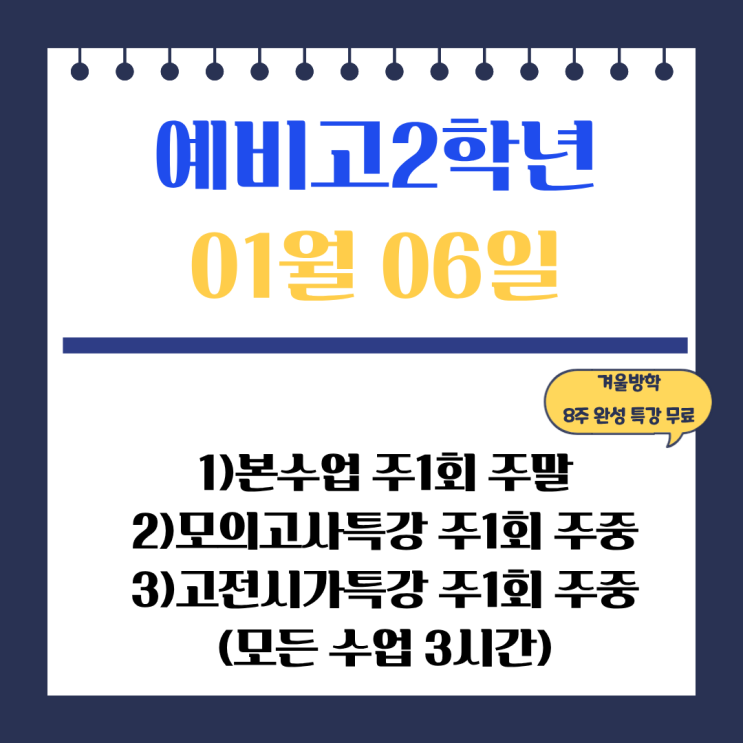 1) 본수업 3시간 주말(고2학년 대비, 문학,독서,화작) 2) 수능 모의고사 대비 특강 3시간 (고2 기출 모의고사 7회 완성) 3) 고전시가 기출 특강 3시간 (가사, 연시조 7회 완성)/ 20명 선착순 마감 4) 재원생 특강 무료/ 비재원생 7주 26만원 1) 본수업 3시간 주말(고3학년 대비 수능 기출문제 분석, 문학,독서) 2) 수능 모의고사 대비 특강 3시간 (고3 기출 6월,9월 평가원, 수능기출 7회 완성/문제풀이 해설 포함) 3) 고전시가 기출 특강 3시간 (가사, 연시조 7회 완성)/ 20명 선착순 마감 4) 재원생 특강 무료/ 비재원생 7주 28만원 <img src="https://blogthumb.pstatic.net/MjAyNTEyMTdfMjg1/MDAxNzY1OTc4ODE3NjEz.zJHEnopfsdCa7QDavVQBjXKjJJ61iUg4w_OeD0x8DhQg.u1i32EEmCutNgjjeRS5YYV3Rr6x0XsmyErkfI0IdlUUg.PNG/%C1%A6%B8%F1%C0%BB_%C0%D4%B7%C2%C7%D8%C1%D6%BC%BC%BF%E4..png?type=s3" />