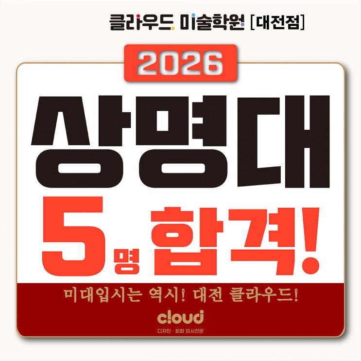 안녕하세요! 대전클라우드 미술학원 입니다. 입춘이 지났음에도 불구하고, 봄을 시샘하는 꽃샘추위가 제법 매섭습니다. 저희 대전클라우드 미술학원의 열기만큼은 이미 완연한 봄을 맞이한 듯 뜨겁습니다! 오늘은 2026학년도 수시와 정시에서 고른 합격결과를 만들어낸 상명대 최종결과 소식과 함께 이번 정시전형에서 출제되었던 문제들을 분석해보는 시간을 준비했습니다. 2027학년도 상명대 입시를 목표로 하는 학생들이라면 오늘 포스팅으로 많은 도움이 되길 바랍니다. 19년 연속 합격결과!! 상명대 입시는 역시 "대전클라우드 미술학원!" 올해 저희 대전클라우드 미술학원은 2026학년도 단한해 5명의 상명대 합격생을 배출하며, ....... <img src="https://blogthumb.pstatic.net/MjAyNjAyMTBfNzYg/MDAxNzcwNzAyMzMyOTYy.eAWqpz2waYK4Unbpv77wX1xpQaBNggFkfUyOvcyufrIg.ZHDt_87qVR64LBwywVe5wzSiODxnlnUXJAe3xttfTLUg.JPEG/IMG_2569.jpeg?type=s3" />