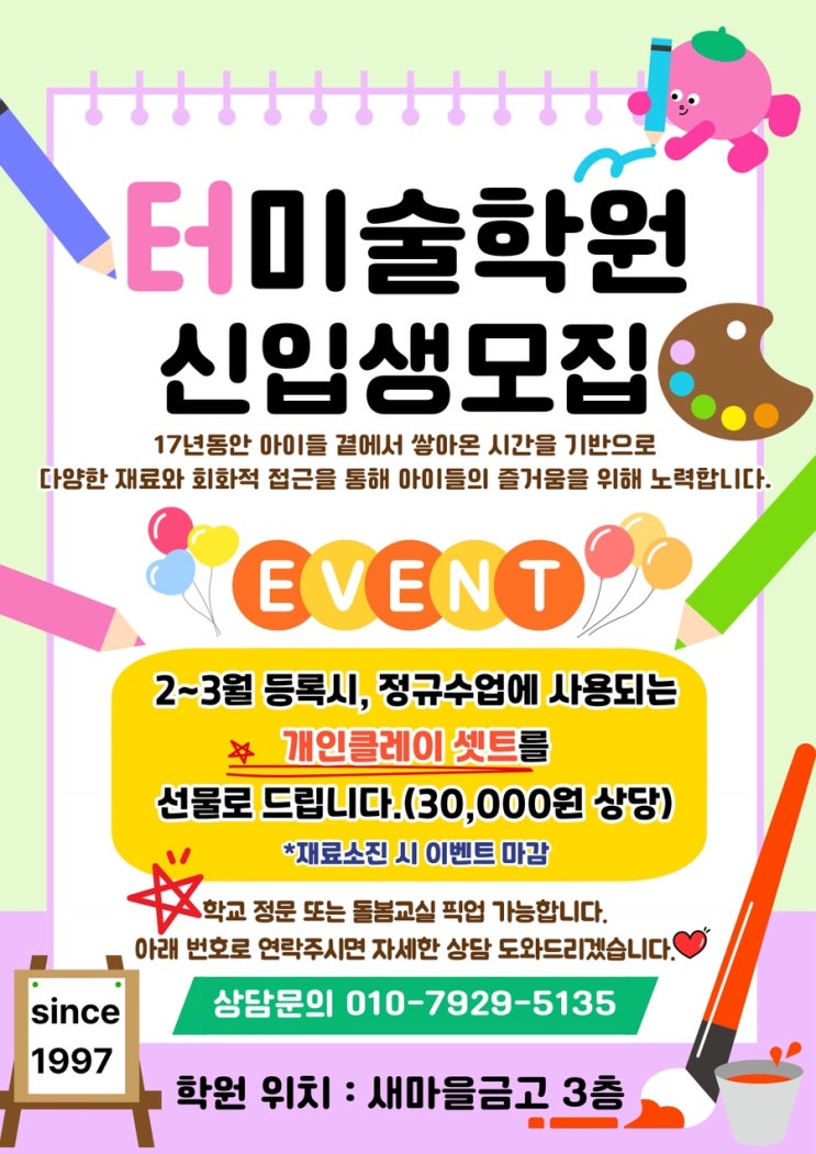 터미술입니다~!! 새학기와 입학을 맞이해서 이벤트 시작합니다아~ 2월~3월 안으로 등록을 하게 될 시에는 개인클레이 셋트를 드립니다 저희 터미술에서는 회화 !그림그리기는 물론이고, 색종이접기, 클레이 를 기본적으로 수업을 하고있는데요, 클레이는 아이들이 제일 좋아하는 수업재료 중 No.1입니닷 ㅋㅋㅋ 그래서 제가 체험수업 때 가장 많이 사용했던 수업재료이지요 아이들의 긴장감을 무력화 시켜주는 고마운 ㅎㅎ 그래서 이벤트를 준비했어요~~ 클레이로 했던 수업들 보여드릴게욥!! 아래는 시계만들기 수업이었는데요,ㅎㅎ 숫자를 클레이로 하니 너무 통통하고 포인트로 귀엽더라구요~ 이렇게 저희 터미술에서 하는 작....... <img src="https://blogthumb.pstatic.net/MjAyNjAyMTFfMjg0/MDAxNzcwNzc1MTY3MTcy.DggwthlvPwVzwrnu08CGiG2y9E7BiIrkaQ8du2fn3Hog.5DDzVKdfIKqGsgltv1tafQuD9IdXPee-Z5hPIsiKXy4g.JPEG/IMG%A3%DF9458.JPG?type=s3" />