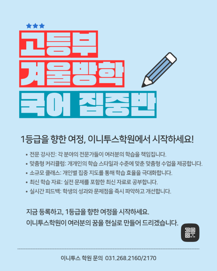 수원정자동국어학원- 고등부 국어 겨울방학특강(문학. 독서.문법) [국어.영어.수학.과학 단과 학원] 이니투스 고등국어는 주중반 또는 주말반으로 구성되어 있습니다. 반별 인원은 최대 10명이고 수업방식은 판서수업 후 학생 한명 한명 개별지도하는 방식입니다. ■ 겨울방학특강 개강일: 1월3일(토요일) 이번 겨울방학특강은 '국어의 틀을 세워 깊이를 더하자' 입니다 어떤것이 시험에 나오고 왜? 이 파트가 중요한지 학습의 방향을 잘 잡는것이 중요합니다. 겨울방학 동안에는 문제를 잘 풀기위해 개념정리와 시험에 자주 나오는 문제를 정리하고 문제를 맞히는 연습을 집중적으로 연습하게 됩니다. ■ 수강과목 및 커리큘럼 ■ 고....... <img src="https://blogthumb.pstatic.net/MjAyNTEyMjJfMjg5/MDAxNzY2MzQ3MjU1ODAz.zMsVvU5mSdIKeJvdqLo3yWRUDvK2xszDAMtBT7433cgg.M7Jy0qFwJGznZJAlpropCZijZNxavzc8wQxzPwugncUg.PNG/900%A3%DF%B0%ED%B5%EE%BA%CE_%B0%DC%BF%EF%B9%E6%C7%D0%A3%DF20251216%A3%DF103436%A3%DF0000.png?type=s3" />