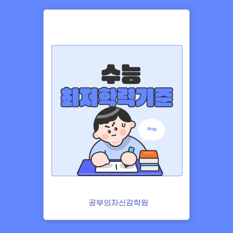 대입 수시를 준비하다 보면 반드시 등장하는 말이 있습니다. 바로 수능 최저학력기준입니다. 이런 경우, 원인이 수능 최저인 경우가 정말 많습니다. 이번 글에서는 수능 최저학력기준이 무엇인지, 왜 중요한지, 어떻게 대비해야 하는지 아주 쉽게 설명해 드리겠습니다. 수능 최저학력기준이란 수시 전형에서 서류·면접과 별개로 반드시 충족해야 하는 수능 성적 기준입니다. 아무리 서류가 좋아도 최저를 못 맞추면 불합격입니다. 수능 최저학력기준이란? 수능 최저학력기준은 수시 전형 지원자가 최소한 이 정도의 수능 성적은 받아야 한다고 대학이 정해 놓은 기준입니다. 모든 대학/학과에 적용되는 것은 아니며, 대학/전형/학과별로 다 다릅....... <img src="https://blogthumb.pstatic.net/MjAyNTEyMjRfNTkg/MDAxNzY2NTY3MzA1NDA5.6LtyuBO2hRSvVA5C1nHLzw2HRCG8DGTycQE3t3Iq_EQg._BZbbmwqRM8R1_DijG3sjpAtxGggw1O-LRf_BbQGMzEg.PNG/%C1%A6%B8%F1%C0%BB_%C0%D4%B7%C2%C7%D8%C1%D6%BC%BC%BF%E4._%2812%29.png?type=s3" />