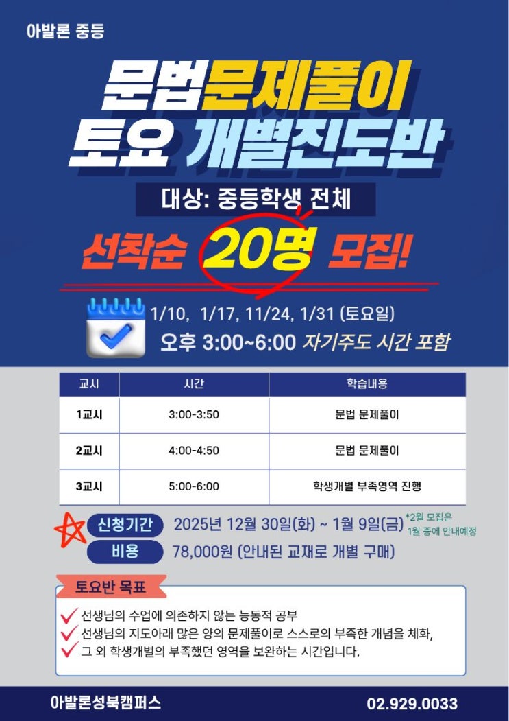 ●길음동 길음뉴타운 중등영어 겨울학기 토요 학습관리반 운영 안내