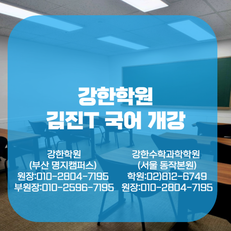 강한학원 국어학원 김진T 개강 안내! 안녕하세요. 강한학원입니다. 오늘은 강한학원 김진T 국어 개강 소식을 전해드릴게요. 김진 선생님은 강남, 종로, 청솔 스카이에듀 재종반 출신으로 16년의 풍부한 강의 경력을 갖추고 있으며, 다수의 수험생을 상위권 대학으로 합격시킨 경험을 보유하고 있습니다. 단순히 문제 풀이 중심 수업이 아니라, 시험을 보는 사고 구조 자체를 잡아주는 수업으로 꾸준히 좋은 결과를 만들어오셨죠. 이번 강한학원 김진T 국어 개강은 내신과 수능을 동시에 대비할 수 있도록 체계적으로 구성되었습니다. 3월 8일 개강, 학년별 맞춤 수업 구성 강한학원 김진T 국어 수업은 3월 8일 시작합니다. 고1 학교별 맞춤내신 수....... <img src="https://blogthumb.pstatic.net/MjAyNjAyMjZfMTAz/MDAxNzcyMDk2MjIxMTE5.WEGi-ewhR686VDuHx5_thB3B8ysKrkd-M5OKSuc_96gg.vfLcAxttYKyldM5OGkr2_bCYmRU5TSr04_0nxtfTzf0g.PNG/%C1%A6%B8%F1%C0%BB_%C0%D4%B7%C2%C7%D8%C1%D6%BC%BC%BF%E4__%BA%B9%BB%E7%BA%BB-015.png?type=s3" />