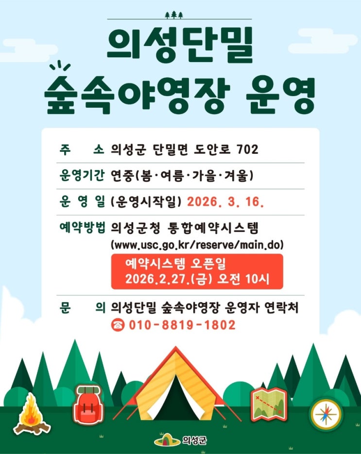 의성 단밀 숲속야영장 운영 안내 자연 속에서 힐링하는 시간, 의성 단밀 숲속야영장이 다시 문을 엽니다 위치 의성군 단밀면 도안로 702 운영기간 연중 운영 (봄·여름·가을·겨울) 운영 시작일 2026. 3. 16. 예약방법 의성군청 통합예약시스템 예약 오픈 2026. 2. 27.(금) 오전 10시 문의 의성 단밀 숲속야영장 운영자 ☎ 010-8819-1802 푸른 숲, 맑은 공기, 자연과 함께하는 캠핑을 의성에서 즐겨보세요⛺✨ #의성군 #의성캠핑 #단밀숲속야영장 #의성가볼만한곳 <img src="https://blogthumb.pstatic.net/MjAyNjAzMDFfMjYy/MDAxNzcyMzU0NTE3MDI2.ZD0rC6aHSVxpwgGV3RpxoReDcfneCjjaLAPDLEIyUlYg.GWLJmDZlhPy-M00zVKLa7NaTZ0ymS3iRTdAChm2LWU0g.JPEG/900%A3%DFFB%A3%DFIMG%A3%DF1772354492466.jpg?type=s3" />