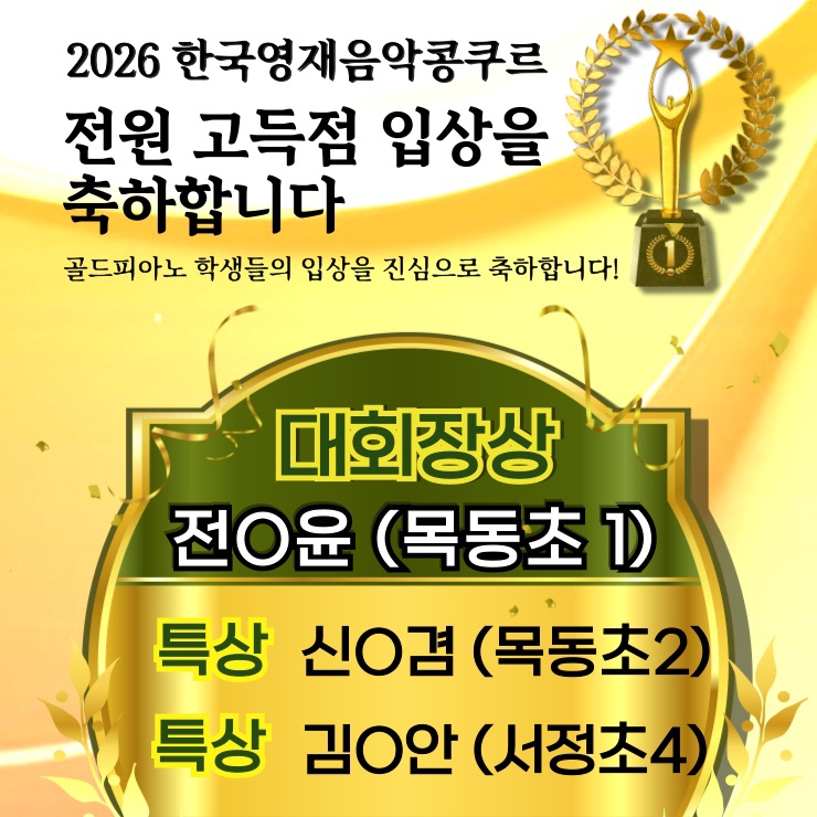 골드피아노 2026년 2월 한국영재음악콩쿠르 입상결과 축하합니다 추운 겨울에 모두 4개월동안 열심히 연습하느라 고생한 아이들 유난히 참가자가 많아서 더욱 떨렸지만 모두 멋지게 준비한 만큼 연주하고 왔답니다. 안정된 연주자세와 예쁜 소리로 칭찬을 많이 받은 우리 골드피아노 학생들의 입상을 축하합니다 <img src="https://blogthumb.pstatic.net/MjAyNjAyMThfMzAg/MDAxNzcxNDE4ODQ1NjMx.R6yM_NuMyCuoZIqVR8Ju84HAw9OAsA-0x3d2hH9wiM0g.eweVJ_IZIbUT29BnRUQ7Zp-bJ6KLC4pN0pMZqFDKsQsg.JPEG/output%A3%DF2143084637.jpg?type=s3" />