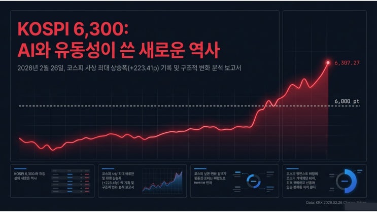KOSPI 6,300 돌파 분석 보고서 — AI 반도체 랠리와 머니무브가 만든 사상 초유의 기록 — 2026년 2월 26일 기준 요약: 무슨 일이 일어났나? 2026년 2월 26일, 코스피 지수가 전 거래일 대비 223.41포인트(3.67%) 급등한 6,307.27에 장을 마감했습니다. 전일 6,000선을 처음 돌파한 지 단 하루 만에 6,300선까지 돌파한 것으로, 하루 상승폭이 200포인트를 넘어선 역대급 기록입니다. 1. 핵심 시장 데이터 ▎ 투자 주체별 매매 동향 외국인이 2조원 이상의 대규모 순매도를 기록했음에도 불구하고, 개인과 기관이 물량을 받아내며 지수를 밀어 올렸습니다. 국내 수급 체력이 재확인된 사례로, 이는 과거 외국인 주도 장세와는 질적으로 다른 구조....... <img src="https://blogthumb.pstatic.net/MjAyNjAyMjdfMjQw/MDAxNzcyMTgyNjE1MzE3.QGPrufOUmWqXYZjutNDuXW6JAnaOQPLwHRUNwraWFoQg.XY1a0DEGAqaNtZC_yuN5lU3XIq_jY_iysCt7PXY0hjAg.JPEG/%3F%8A%AC%3F%9D%BC%3F%9D%B4%3F%93%9C1.JPG?type=s3" />