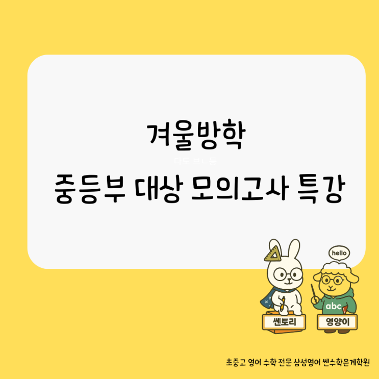 "나무가 아니라 숲을 보는 힘을 만들기" 안녕하세요. 삼성영어 쎈수학 은계학원 달님쌤입니다. 겨울방학 동안 중등부 특강에서는 고등 영어를 대비하기 위한 모의고사 특강을 진행했습니다. 이번 특강의 목표는 단순한 문제풀이가 아니라, 글을 읽는 힘, 전체를 보는 힘을 키우는 것이었습니다. 왜 중등 때 모의고사를 할까요? 고등 영어는 단어만 많이 안다고 되는 시험이 아닙니다. ✔글의 흐름 이해 ✔ 핵심 내용 파악 ✔ 문제 유형별 전략 이 세 가지가 필요합니다. 그래서 이번 겨울 특강에서는 다음 영역을 집중 훈련했습니다. 듣기 유형 정리 대의 파악 도표 문제 해결 이야기 구성 요소 이해 목표는 분명했습니다. “고등 모의....... <img src="https://blogthumb.pstatic.net/MjAyNjAyMTlfMTcx/MDAxNzcxNDYxMTczNDk4.-JZTcxwgI82-9QVuJF3XVWyizOlCfVgIWmxoFYo2Rw8g.HAuhweIx9YP5YlUgLQaBIV_2z6w0-lS8jnuOKy7NTcQg.PNG/Yellow_coming_soon_Instagram_post_%284%29.png?type=s3" />