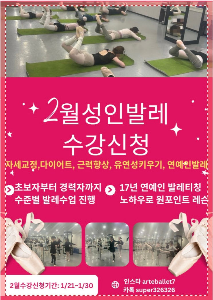 안녕하세요^^ 성인발레전문학원 아르떼발레입니다~~ 이번주 내내 영하10도 이하로 떨어진 날씨로 집에만 움크리고 계신거 아닌가요 아르떼 성인발레 비기너반 올 출석에 기적이 일어나고 있는 주간이에요 ㅋㅋ 여러분~~몸이 구부정해지는건 몸이 게으르다는 증거에요..ㅜㅜ 상체에 근육이 빈약하여 계속 구부정해는....마치 80대 노인분들처럼요 한번뿐인 인생 구부정하게 계속 살순 없죠~!! 성인발레수업으로 바른자세 틀 제대로 만들어 드릴게요^^ < 2026년 2월 성인취미발레 수강신청 > ▶ 오 전 반 ◀ 비기너반 1 ( 발레 처음배우는분들 원포인트 레슨 ) AM 10: 30 ~ 11: 20 까지 화,목 ( 주2회 수업 ) 비기너반 2 ( 발레 처음배우는분....... <img src="https://blogthumb.pstatic.net/MjAyNjAxMjFfMjEw/MDAxNzY4OTk3MTI1MTE0.ddPaFQEOvANLWPsMlhpgfjdv-zCWFxBjOBBlSdYtlowg.dSrajDk7tGRhYhch1AtYrefO3quQOgL5zcMPsf8bFycg.JPEG/970AC07A-8974-428E-ADC7-153C63349543.jpeg?type=s3" />
