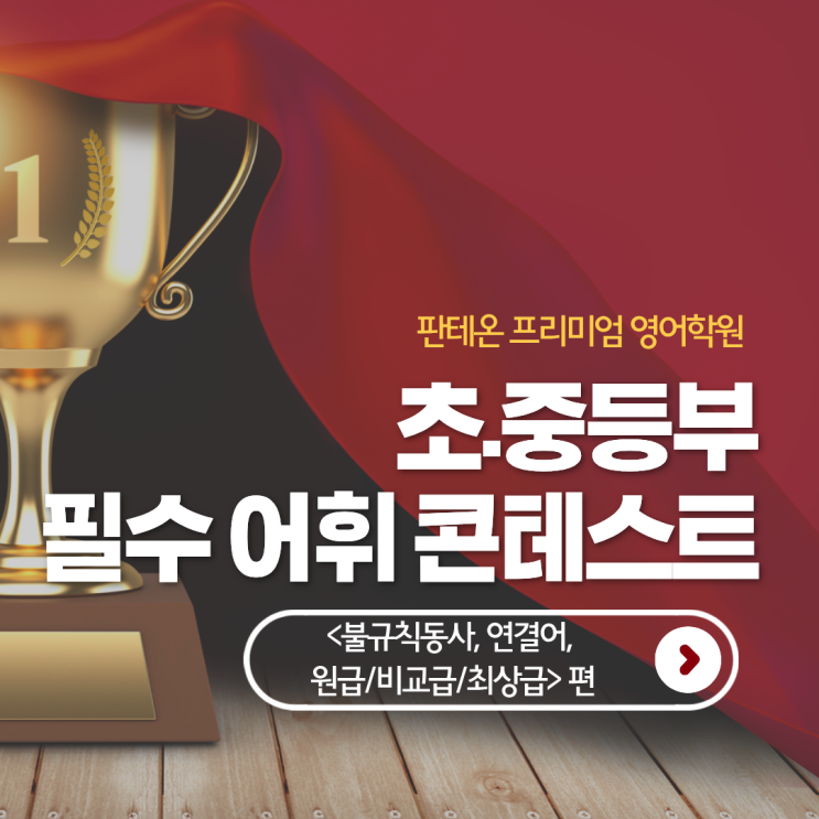 안녕하세요~! 판테온 프리미엄 영어학원입니다! 벌써 3월을 넘어 2026년의 상반기로 접어들고 있습니다. 저희 판테온에서는 매월 진행하는 초.중등부 판테온 프리미엄 필수 어휘 콘테스트 -불규칙동사편-, -연결어편-, -원급/ 비교급/ 최상급편-을 공지드리려 합니다. 판테온 프리미엄 영어학원 초.중등부 필수 어휘 콘테스트 3월 -불규칙동사편-, -연결어편-, -원급/ 비교급/ 최상급편- 대상 : 초등 4,5,6학년 원생 및 외부원생 (무료) 실시: 3월 26일 (목), 27일 (금) 수상: 100점 혹은 최고득점 학생 대상 : 중학생 및 외부원생 (무료) 실시: 3월 19일 (목), 20일 (금) 수상: 100점 혹은 최고득점 학생 이번 3월은 기존학생, 신입생이 동시 시....... <img src="https://blogthumb.pstatic.net/MjAyNjAzMTJfMTQy/MDAxNzczMzA4MzI5ODY2.wpR0dVuKPT8pN0RPddTwavrzTJCUZNZ6P5iCzKTpZwsg.yy-MlbJzfD8qV4x8iy-LhGZHTOamPywoBfuD2gJXZiYg.PNG/%C1%A6%B8%F1%C0%BB_%C0%D4%B7%C2%C7%D8%C1%D6%BC%BC%BF%E4.-_%BA%B9%BB%E7%BA%BB.png?type=s3" />