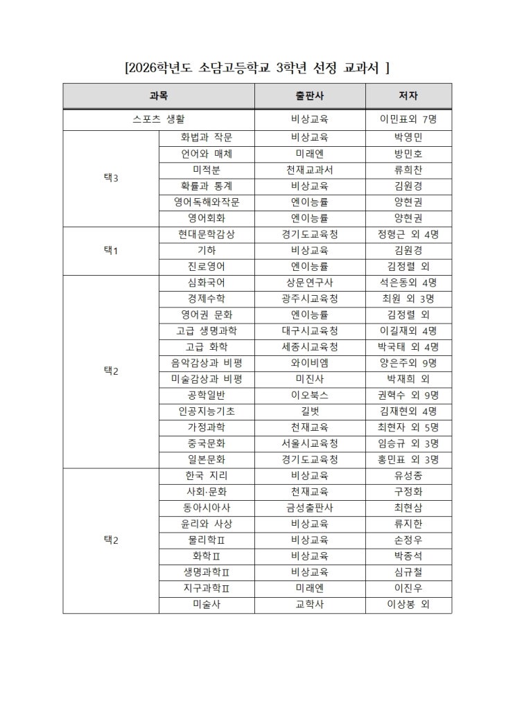 2026 세종시 소담고등학교 교과서 출판사 정리