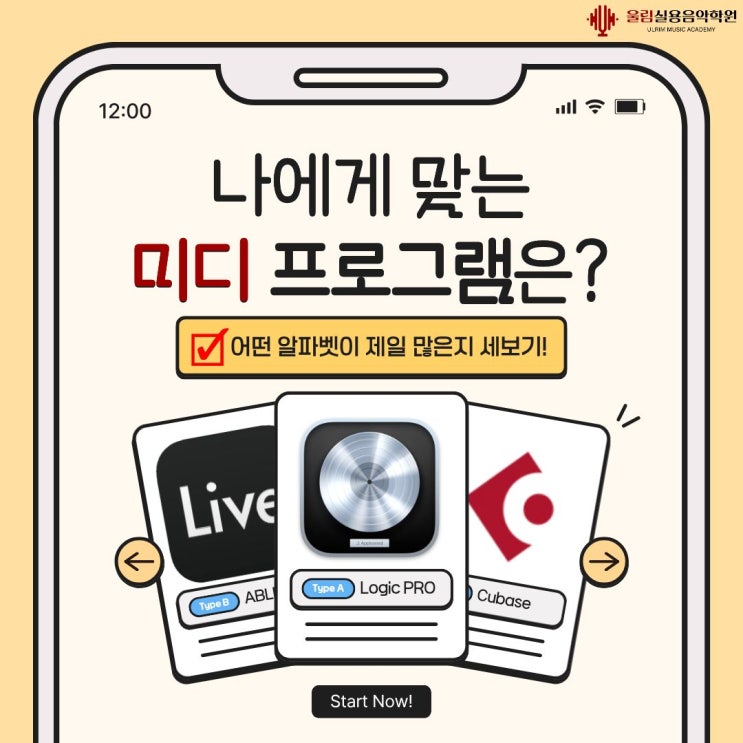 안녕하세요 은평구 실용음악학원, 울림실용음악학원입니다. 작곡을 처음 시작하시는 분들이 가장 많이 고민하는 것 중 하나가 바로 “어떤 DAW를 써야 할까요?” 입니다. DAW는 쉽게 말해 음악을 만들 때 사용하는 프로그램인데요, 종류가 다양하다 보니 처음 시작하시는 분들은 선택이 쉽지 않습니다. 그래서 오늘은 많이 사용되는 대표적인 DAW인 Logic Pro Cubase Ableton Live 이 세 가지를 기준으로 은평구 실용음악학원 울림 실용음악학원에서 나에게 맞는 DAW를 고르는 방법을 쉽게 정리해드리겠습니다 DAW 선택, 성향에 따라 달라집니다 같은 작곡 프로그램이라도 사용하는 사람의 스타일에 따라 잘 맞는 DAW가 달라집니다. ✔....... <img src="https://blogthumb.pstatic.net/MjAyNjAzMjNfMTY2/MDAxNzc0MjYxMDIxOTI1.0gV_1IrSCvwOiTFeunlAMZT5s0ZNCVkTC3acH1q0tHog.t0Sqx7sSE6kS6DZiwpxzbvUVVmHPGkVBBg2SS10g0kEg.JPEG/1.jpg?type=s3" />