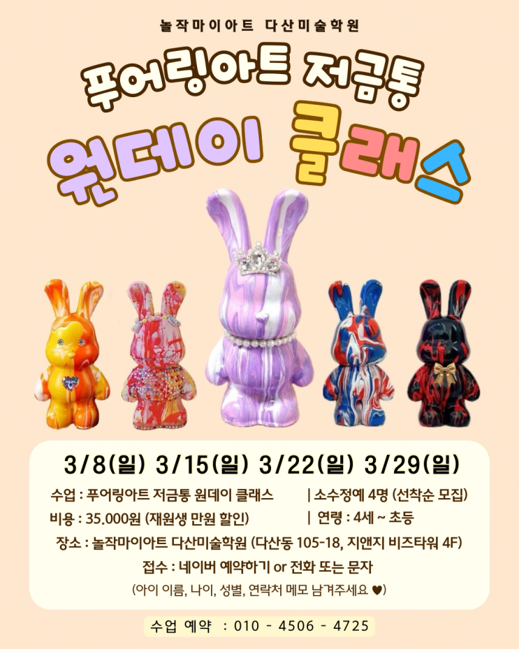 안녕하세요 놀작마이아트 다산미술학원입니다^^ 매달 새로운 주제로 찾아오는 일요일 원데이 클래스에 초대합니다^^! ♡푸어링아트 토끼 저금통 원데이♡ 색을 '흘러보내며'만드는 예술 아이들이 직접 원하는 컬러를 자유롭게 조합하고, 물감이 만들어낸 우연의 마블링을 경험하는 수업입니다^^ ★색의 원리를 자연스럽게 이해해요. ★계획+우연이 만나 창의력이 확장돼요. ★마블링 작품 위에 다양한 장식으로 마무리하며 표현력을 더해요. 대상:4세~초등 수업시간: 70분 비용:35,000(재원생 만원 할인) 완성 작품은 인테리어 소품으로도 손색이 없어요^^♡ 감각적인 색경험, 성취감까지 함께하는 우리 아이 첫 푸어링아트 클래스, 지....... <img src="https://blogthumb.pstatic.net/MjAyNjAzMDNfMjAw/MDAxNzcyNTE1NTE3NDQ5.7ML7yswvovSMUSDOadh6xSVl9l7JRGap6GlIR09f0hAg.lLmd2sX71FIVAnJiHONevBC9zQX4H5auVQLhUYi42xgg.PNG/KakaoTalk_20260227_161915045.png?type=s3" />