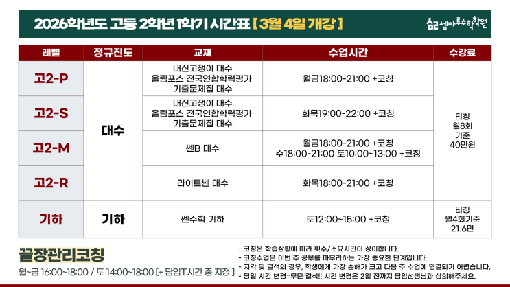 3월개강!!1학기 셈마루 수학학원 하이클래스 시간표 [고등수학/통합과학/생명/화학]