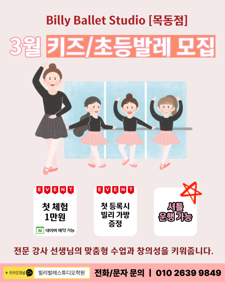 안녕하세요 빌리발레스튜디오 [목동점] 입니다. 따스한 햇살이 반기는 3월이 찾아왔어요 새 학기 새 출발을 발레와 함께 시작해볼까요? 작은 발끝에서 시작되는 큰 변화 우리 아이의 자신감이 쑥쑥 자라는 시간 <현재 개강 반> 수요일 pm15:30-16:20 키즈반 목요일 pm16:10-17:00 키즈반 3명 이상 모집 시 다른 요일 수업 개강 가능합니다. [목동점] 키즈/초등발레 시간표 ✅ 셔틀운행 가능⭕️ ✅ 첫 체험비 1만원 ✅ 첫 등록 시 빌리 굿즈 증정 (티셔츠, 가방, 파우치) ☎️ 수업 문의 : 010 2639 9849 (전화, 문자 모두 가능) 카카오채널 - 빌리발레스튜디오학원 <img src="https://blogthumb.pstatic.net/MjAyNjAyMjdfMjM1/MDAxNzcyMTc4NjM1NjM5.1Oa5OgqVHuD8q8sHt9qdhyuaERQwrF6XtZLwGSkiZYIg.0SxHvBAuZUzImPg1v25uQNozbPYTIklbQ7EH99-94vwg.PNG/2.png?type=s3" />