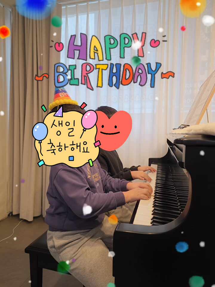 안녕하세요, 프레피아노입니다 내일 엄마의 생신이라며 이제 2학년 올라가는 친구가 생일축하노래를 배우고 싶다고 하더라고요. 혼자 치고싶다고 했지만 당장 내일이라 왼손 반주까지 배워서 영상까지 찍으려면 너무 시간이 촉박하여 5학년이 되는 형과 함께 듀엣으로 연주하는걸 제안했어요! 악보는 2줄로 짧지만 멜로디, 박자, 페달까지 완벽하게 연습해내려고 초초초집중모드를 보여주었습니다. 특별한 선물인만큼 귀여운 필터를 씌워 분위기를 살렸습니다. 당일 오전에 집에서 직접 서프라이즈 연주를 보여준 뒤 영상으로 보내달라는 요청도 있었습니다.ㅎㅎ 집중모드인 표정과 그 후에 해맑게 웃는 모습을 보여드릴 수 없어서 아쉽습니....... <img src="https://phinf.pstatic.net/image.nmv/blog_2026_02_25_2299/45n7gVBjzp_03.jpg?type=f480x480" />