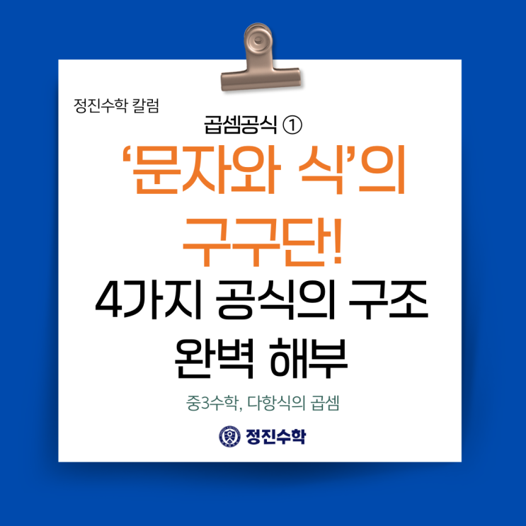 안녕하세요 생각의 깊이가 다른 수학, 세종시 도담동 수학 전문 정진수학입니다. 초등학교 시절, 우리는 덧셈과 뺄셈을 넘어 곱셈을 빠르고 정확하게 하기 위해 '구구단'을 열심히 외웠습니다. 처음에는 헷갈렸지만, 구구단이 입에 붙고 나니 어떤 복잡한 숫자 계산도 척척 해낼 수 있었습니다. 중학교에 올라오면 우리는 아주 중요한 개념의 확장을 경험합니다. 바로 계산의 대상이 '수'에서 '문자와 식'으로 확장되는 것입니다. 그런데 여기서 꼭 기억해야 할 사실이 있습니다. 문자와 식도 숫자처럼 똑같이 연산이 가능하며, 그 연산의 원리는 수의 연산과 완벽하게 똑같다는 것입니다. 초등학교 연산의 기본 토....... <img src="https://blogthumb.pstatic.net/MjAyNjAzMTlfMjU4/MDAxNzczOTA4NTcxODk2.xDRoNPyRE-tRm9shYTOKmf4X0Ox3swzFdmroEoqPQGYg.34SL5mJJxGplhiQGBiOwCXlzL_-bsYGbAXKe20K5xMsg.PNG/%C1%A4%C1%F8%BC%F6%C7%D0_%C4%AE%B7%B3_-_%B0%F6%BC%C0%B0%F8%BD%C4%28%C1%DF3%29.png?type=s3" />