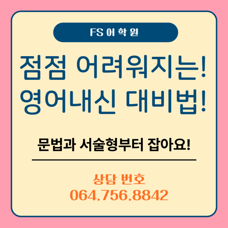 2월도 중순이 되고 설명절이후 신학기를 준비해야 하는 분주한 시기가 되었습니다! 안녕하세요. 제주 삼화지구 영어학원 FS어학원입니다! 2025학년도 2학기에 중학생 첫 영어 내신을 경험한 1학년 학생들, 이제 2학년이 되면 1학기부터 본격적으로 내신 성적이 중요해집니다. 초등학교에서는 알지 못했던 시험이라는 것을 처음 겪은 중학교 첫 내신, 그 결과를 보시고 어떤 느낌을 받으셨나요? 2026학년도에는 영어시험 형태가 더 복잡해지는데, 현재 준비 상황은 괜찮으신지 궁금합니다. 중1부터 내신 성적이 기대에 미치지 못했다면, 중2 영어 내신을 위한 준비를 빨리 시작해야 합니다. 저희 삼화지구 영어학원 FS어학원의 경험상 기초 학력이....... <img src="https://blogthumb.pstatic.net/MjAyNjAyMTZfMTQw/MDAxNzcxMjI5NjA5OTY5.XVX_DGN_WJZ1qY02l0qSNe1ydz6zsef3WbZ0PNAKwCsg.wYdeNJpQxbOGpVayyj225LAGy8i4bidTiUki_TMm50Eg.PNG/%C1%DF%B5%EE%BF%B5%BE%EE%B3%BB%BD%C5%B4%EB%BA%F1%B9%FD-002.png?type=s3" />