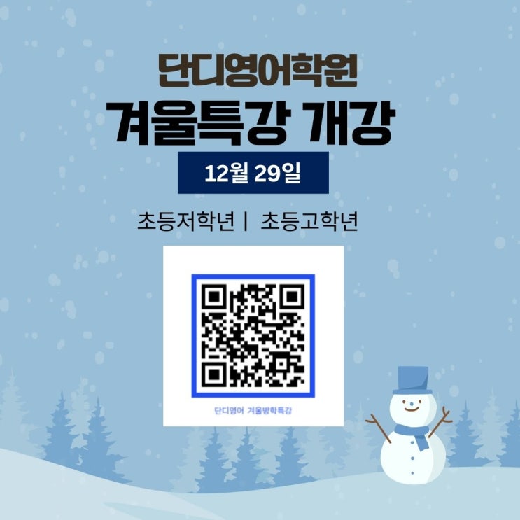안녕하세요, 지니 샘입니다. 벌써 2025년이 저물어가고, 아이들이 손꼽아 기다리던 겨울방학이 다가왔습니다. 이번 겨울방학에는 우리 학원에서 알차고 재미있는 동도초 단디영어 리드앤톡영어도서관 겨울방학특강 을 준비했어요! 아이들이 즐겁게 배우며 한 단계 더 성장할 수 있도록 정성껏 준비했답니다. 동도초 단디영어 리드앤톡영어도서관 겨울방학특강수업은 주 2회, 2시간으로 진행됩니다. 1시간 동안 문법(Grammar)을 집중적으로 학습하며, 이어서 30분간 작문(Writing) 연습을 통해 활용하는 능력을 키울 예정입니다. 마지막 30분은 어휘(Vocabulary) 테스트 시간으로 방학기간 어휘실력을 향상 시킬예정입니다. 수강료 안내 정규 수강....... <img src="https://blogthumb.pstatic.net/MjAyNTEyMjNfMjcg/MDAxNzY2NDg2Nzg2MDU1.Ztlkh9052flmvbvmDlVgx1LtkaxuUc9ZaAFwFxrXDhgg.E_H4398IwHxem5JJsuqmT1ApKgGXo67M6_r8oX2aW2Ag.JPEG/1.jpg?type=s3" />