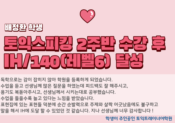오늘은 토익트레이너에서 지나쌤만의 교재와 세심한 피드백으로 좋은 점수를 얻은 배정환 학생의 후기를 알아봅시다 (๑•᎑•๑) 1. 첫째주 후기 전 혼자 토익스피킹을 준비하려고 하였습니다. 그래서 시OOO라는 유명 유튜버의 책을 구매해서 하려고 하였는데 도저히 감도 안잡히고 그래서 걱정만 안고 시험을치지 않고 학원에 등록하여 회사에 지원 요건을 만족하기 위해 일단 커리큘럼을 따라가보자라는 생각으로 불안감을 가진채 수업을 진행하였습니다. 2. 둘째주 후기 주말에 지나쌤께 많은 질문을 하였는데 용기를 북돋아주시고 진짜 하라는 것만 했습니다. 전 2주간의 교육 후 바로 시험을 친 학생인데 2주차 둘째날 온라인 모의고사를 쳤....... <img src="https://blogthumb.pstatic.net/MjAyNjAzMjNfMTE3/MDAxNzc0MjYyODY2OTAx.n4tBLFhLhc0hlHbQNFJBnCRDNVSqFimbzwVTnQvbwtog.R3JhpCw4LMPyvqcJFhAB5EAQb3EGU7DWyUPoVyJ-oUQg.PNG/%B9%E8%C1%A4%C8%AF.png?type=s3" />