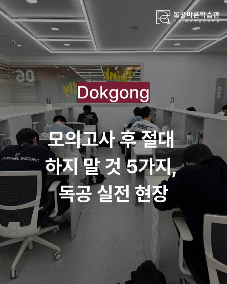▶▷ 독공바른학습관 입학 신청 ◁◀ 안녕하세요! 울산 관리형독서실 독공바른학습관입니다. 수험생 여러분, 최근 치러진 모의고사 보느라 정말 수고 많으셨습니다!! 시험이 끝나고 나면 안도감과 함께 성적에 대한 불안감, 혹은 실망감 등 복잡한 감정이 드실 텐데요. 하지만 기억하세요. 모의고사는 말 그대로 '모의' 시험일 뿐입니다. 진짜 승부는 수능 날이죠! 오늘 독공바른학습관에서는, 많은 수험생이 모의고사 직후 범하는 치명적인 실수들을 방지하기 위해 '모의고사 후 절대 하지 말 것 5가지'를 정리해 드립니다. 더불어, 24일 모의고사 이후 긴장감 넘쳤던 25일 독공바른학습관의 실제 모의고사 실시....... <img src="https://blogthumb.pstatic.net/MjAyNjAzMjdfODUg/MDAxNzc0NTk5OTk2MTMz._DfSEB9vG-lzcw9JDVmUW3d69AifCtA1EtVSqggIjEkg.wb25M1-u9sTzd3d_AIgh8nWD2iapm42JWo-Lw8lAj5cg.PNG/%C1%A6%B8%F1%C0%BB-%C0%D4%B7%C2%C7%D8%C1%D6%BC%BC%BF%E4_-001_%2842%29.png?type=s3" />