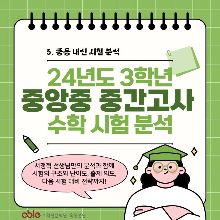 안녕하세요! 울산수학학원 에이블 수학과 팀장 서정혁입니다. 혹시 이런 생각 해보신 적 있지 않으신가요? 이번 포스팅에서는 2024년 울산중앙중학교 3학년 1학기 중간고사 수학 시험을 직접 분석해봤습니다. 중3 수학 목차 전체를 기준으로 어느 단원에서 얼마나 출제됐는지, 그리고 중3 수학을 앞으로 어떻게 준비해야 할지까지 함께 정리했어요. 울산중앙중학교 수학 내신을 준비하는 학생, 그리고 학부모님께 실질적인 도움이 되길 바라는 마음으로 작성했습니다. ✅ 이번 포스팅 목차 1. 시험 총평 — 난이도와 출제 경향 2. 문항별 분석 — 객관식 15문항 + 서술형 6문항 3. 다음 시험 대비 전략 3가지 4. 에이블 중등부 수업 방향 1. 시험....... <img src="https://blogthumb.pstatic.net/MjAyNjAzMzFfOTkg/MDAxNzc0OTMwMzA0MzYx.o8VgOvLQ2Cb5QX5eDQoh15Zchx3flXx_SEFlGPGheoEg.p74NcuxuFYcwykWgi9fkUdSek_BMEE-GuqLEfAxj2ikg.JPEG/1.jpg?type=s3" />
