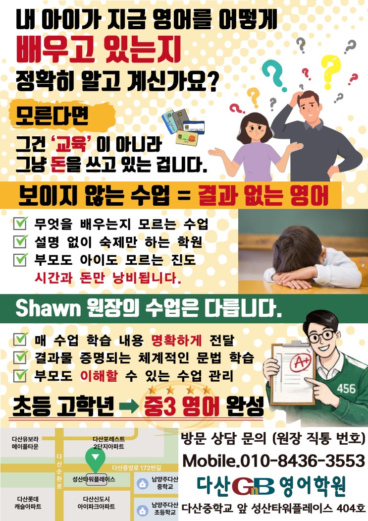 안녕하세요! 다산지앤비(GnB) (초등) & Shawn's English with Parallax (중등) 영어학원의 원장 Shawn입니다! 아이를 학원에 보내면서 한 번쯤 이런 생각 해보신 적 있으신가요? “우리 아이가 지금 영어를 어떻게 배우고 있는지…” 단어를 외우고 있는지, 문장을 이해하고 있는지, 아니면 그냥 시간만 보내고 있는지. 솔직히 말씀드리면 이걸 정확히 알고 계시는 학부모님은 많지 않습니다. ❗ 모른다면, 그건 교육이 아닙니다. 조금 직설적으로 말씀드리겠습니다. 아이의 학습 과정과 방향을 모른다면 그건 ‘교육’이 아니라 그냥 돈을 쓰고 있는 것에 가깝습니다. 왜냐하면 공부는 ‘결과’가 아니라 과정이 쌓여서 만들어지는 것....... <img src="https://blogthumb.pstatic.net/MjAyNjA0MDFfMjA1/MDAxNzc1MDE2MDUyNjgy.mxGatk8W7-_cC33ntkXZcC_T4EDaJhvMWbf_jdFSqdcg.TlzWGEmnaQASXO5qaMQ3zPO9AtaaMG0KCSFebRldUbsg.JPEG/1.01_%3F%82%B4%3F%95%84%3F%9D%B4%3F%98%81%3F%96%B4.jpg?type=s3" />