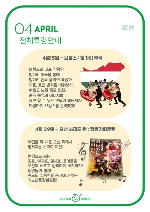 매월 2회로 진행되는 수요 전체특강 안내입니다. 특강이 있는 날에는 피아노 연습 20분 + 특강수업 30~40분 수업으로 진행됩니다. 위위음악학원의 전체특강은? 창의적인 커리큘럼을 바탕으로, 기획부터 제작까지 전 과정을 위위에서 직접 준비하고 현장에 계시는 많은 선생님들께 교육세미나를 진행하고 있어요. 특강에서는 무엇을 배우나요? 클래식 작곡가, 오페라, 영화음악과 음악이론을 역사 • 과학 • 미술 • 게임 활동과 함께 연결하며 음악을 더 입체적으로 이해하게 됩니다. 세마나때 선생님들께서 많이 좋아해 주셨던 브람스 활동지는 위위 고학년 친구들을 위해 다른버전도 준비 예정입니다. 특강사진은 인스타그램에서 만나....... <img src="https://blogthumb.pstatic.net/MjAyNjA0MDFfODAg/MDAxNzc1MDE0NDc5MjIw.tTi85oDjLFpwhwn8v6RV-xG-LR915UKwUHNYs4oGQZog.VomwdXaAlUFcxsLzeBHP6tjT4mMyugEnVdr6ovqPXEsg.JPEG/KakaoTalk_20260331_111220390.jpg?type=s3" />