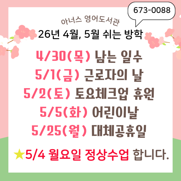 아너스 영어도서관 4월, 5월 쉬는방학 안내