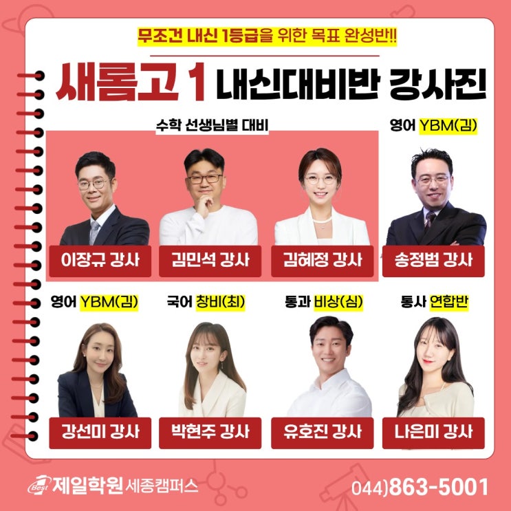 제일학원 세종캠퍼스 학교별 고1 내신 담당 선생님 확정