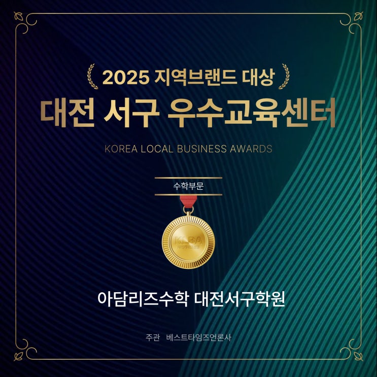 홈정치경제문화사회연예/스포츠로컬어워즈소상공인 아담리즈수학 대전서구학원, 2025 대전 서구 우수 수학학원으로 선정...400여 종 교구 수업과 소수 정예 밀착 관리 아담리즈수학 대전서구학원, 2025 대전 서구 우수 수학학원으로 선정...400여 종 교구 수업과 소수 정예 밀착 관리 발행승인 : 윤재은 기사입력 2026-01-19 [11:41] 대전 서구에 유아부터 초등 저학년까지, 아이들의 '첫 수학'을 책임지는 특별한 교육 공간이 있다. 아담리즈수학 대전서구학원(대표 곽재정)이다. 20년 이상 교육계에 몸담은 전문가가 이끄는 이곳이, 베스트타임즈 언론사가 지역 우수 사업장을 발굴하는 '2025 로컬 어워즈' 대전 서구 우수....... <img src="https://blogthumb.pstatic.net/MjAyNjAxMjBfMjI5/MDAxNzY4ODkwNDQxMTUx.YDU_Yld7vKyS1RLVaB8mYNb0faGr1QHQuF6dVnk99UUg.2xqrx97Rw5T1x2VZdldLnstbXtecB7NautVyjuRth9cg.JPEG/KakaoTalk_20260120_142817490.jpg?type=s3" />
