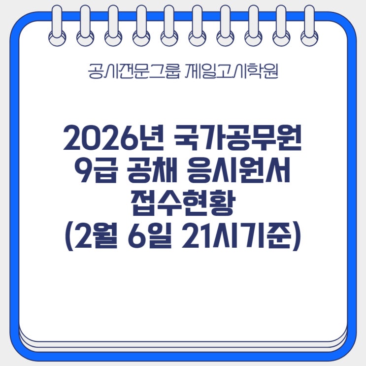 안녕하세요 !!! 제일고시학원 본점 입니다 : ) 오늘 전해드릴 소식은 2026년 국가공무원 9급 공채 응시원서 접수현황 안내입니다. 국가직 원서접수는 2월 6일자로 마감되었으며 지원한 직렬의 경쟁률을 확인하세요! 일반행정직 전국 97.9 : 1 일반행정직 (대전세종충남충북) 96.8 : 1 우정사업본부 (대전세종충남충북) 61.1 : 1 경찰청 전국 56.7 : 1 교육행정직 전국 509.4 : 1 저희 제일고시학원에서는 추후에 응시표 출력을 도와드리고 있습니다. 도움이 필요하면 3층 상담실로 방문해주세요! 이제 정말 다가온 시험들을 위해서 마지막이다라는 생각으로 준비해야합니다. 그렇기에 저희 제일고시학원에서는 3월 모의고사 문제풀이가 개강예정....... <img src="https://blogthumb.pstatic.net/MjAyNjAyMDdfMTUz/MDAxNzcwNDI4ODQ0MjAx.bKr4_jXI6SHIEODoXYi9LV2LC4SW2Xh17tH-S6yiTUcg.RXWZtAuGPgX6M1MOPVGF6BcZRTsqqXVTJZYXQWvv0u4g.JPEG/%C1%A6%B8%F1%C0%BB_%C0%D4%B7%C2%C7%D8%C1%D6%BC%BC%BF%E4_-001_%2885%29.jpg?type=s3" />