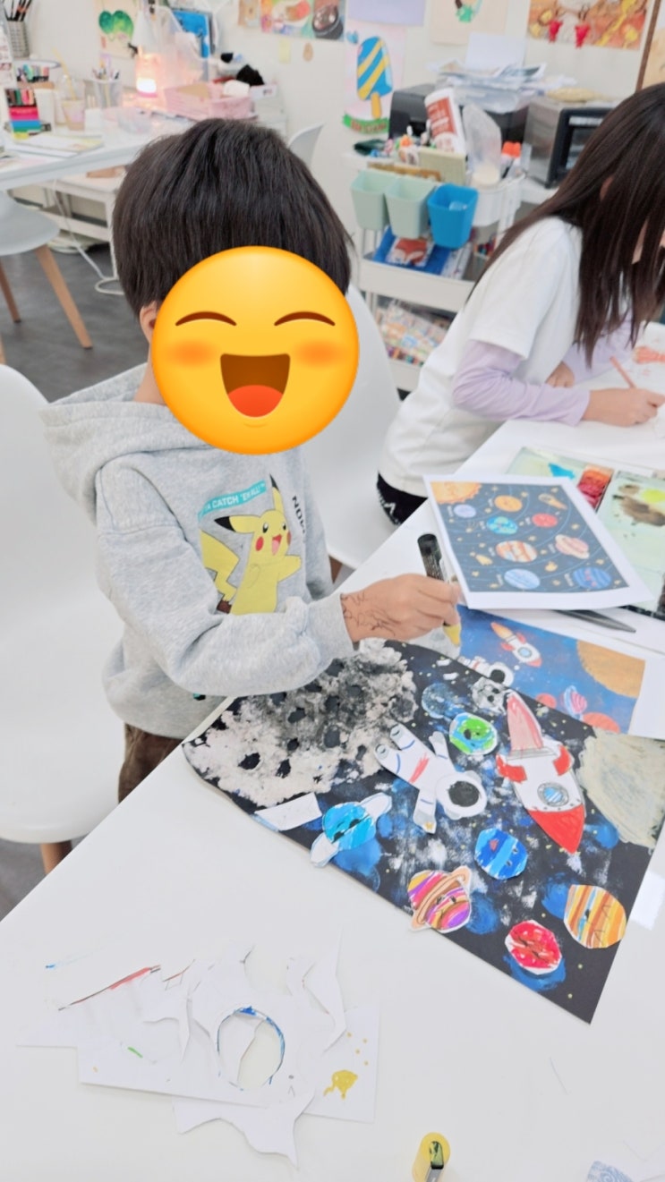 안녕하세요 앤쌤이예요 오늘은 예비초등생의 그림을 들여다볼게요. 검정 도화지 위에 스펀지를 사용해 흰색과 파란색 물감을 톡톡 찍어내며 깊고 넓은 우주 공간을 표현했어요. 점처럼 흩뿌려진 물감 덕분에 별이 반짝이는 밤하늘이 자연스럽게 완성되었습니다. 달 표면은 휴지죽 기법을 활용해 입체적으로 표현했어요. 울퉁불퉁한 질감이 실제 달의 크레이터를 떠올리게 하며, 아이가 손으로 직접 만지고 느끼며 만든 흔적이 그대로 살아 있습니다. 태양계 행성들은 각각 따로 그린 뒤 오려 붙이는 콜라주 방식으로 구성했어요. 줄무늬가 있는 행성, 고리가 있는 행성, 표정이 있는 행성까지— 아이의 상상력이 더해져 우주가 한층 더 즐....... <img src="https://blogthumb.pstatic.net/MjAyNjAyMDVfNzIg/MDAxNzcwMjU0Mjk1Mjg5.---mpxNPifiBgc7UrVxC8_Y6tbPcKHszMziCQHfamacg.5WZhde3FYJ-hvXdA94ySFImKpDyhrH7dzo6Ne9PTv10g.JPEG/900%A3%DF1770254294538.jpg?type=s3" />