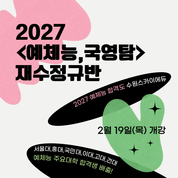 2027학년도 수원 스카이에듀 - 예체능, 국영탐 재수종합반 모집안내 안녕하세요. 수원 스카이에듀학원 입니다. 2027학년도 예체능 입시 - 미대, 체대, 음대를 준비하는 예체능 수험생들을 위해 재수정규반을 모집합니다. 수원 스카이에듀는 수원 지역에서 예체능 입시생들과 12년동안 함께 고민하며 길을 만들어 왔습니다. 공부와 실기를 병행하기에 더더욱 힘든 예체능입시를 준비하는 학생들을 위해 수원 스카이에듀가 함께 하겠습니다. 개강 1차 : 2.19(목) 2차 : 3.3(화) 개강은 1,2차 나눠서 진행이 됩니다. 1차 : 설연휴가 끝나고 바로 시작합니다. 2차 : 실기준비로 인해 몸과 마음이 지친 학생들은 3월부터 시작합니다. 입시결과로 증명....... <img src="https://blogthumb.pstatic.net/MjAyNjAyMDdfMTk0/MDAxNzcwNDU4NzE4NDU1.uFTyQMVzoLqIarMEnIW0O-Fl6bMTlM0ZSfmHuO8noL8g.EUj-CGq50qQRaxmbfs0wWY3V8Ncub-n435a80vwtOQAg.PNG/%C1%A6%B8%F1%C0%BB_%C0%D4%B7%C2%C7%D8%C1%D6%BC%BC%BF%E4..png?type=s3" />