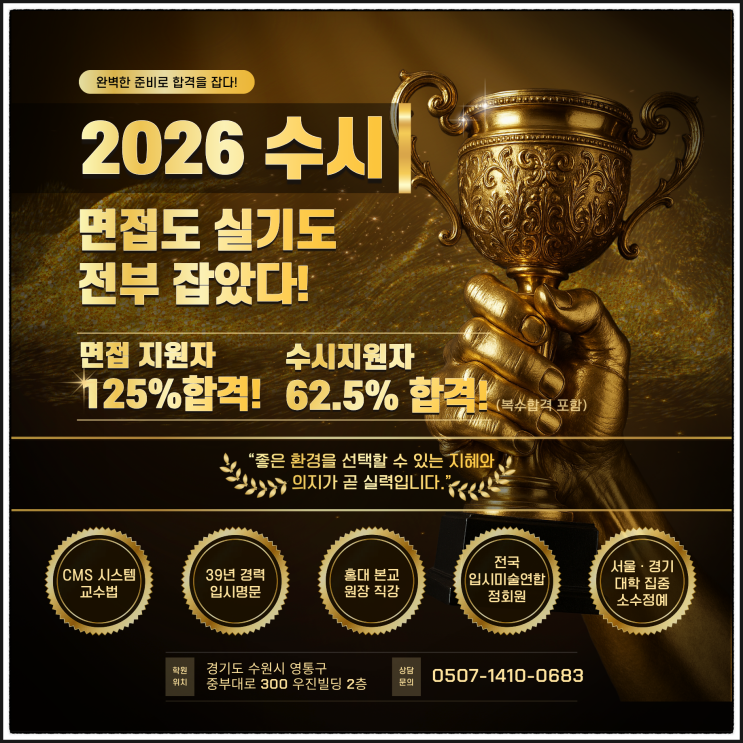 안녕하세요~ 수원미술학원-오늘 Today 입니다. 고단한 길을 걸어온 합격자 여러분, 2026년도 수시 합격을 진심으로 축하합니다~ 여러분의 합격은 우연이 아닙니다. 수많은 연습과 고민, 그리고 불안과 고통 속에서도 포기하지 않은 용기 있는 선택의 결과입니다. 정답 없는 미대입시의 길 위에서 끝까지 자신의 감각과 결심을 믿고 버텨온 시간들이 이 순간을 만들었습니다. 이번 수시 합격은 끝이 아니라 새로운 시작입니다. 앞으로 더 넓은 무대에서 여러분만의 시선과 이야기를 펼쳐 나가게 될 것입니다. 지금의 기쁨을 마음껏 누리되, 여기까지 도달하는 동안 배웠던 '끝까지 노력하는 자세'를 잊지 않기를 바랍니다. 오늘입시미술....... <img src="https://blogthumb.pstatic.net/MjAyNTEyMjZfNDUg/MDAxNzY2NzUwNTk4MDQ1.AeL3oZeiJUusOsCpDetdN9u8xNm3ovPT-WUx0tvR2sog.aArzxln21M1knjXJ5HvLUpVz-JEEn9tBBrc2qnj5Gbcg.PNG/1766749950872.png?type=s3" />