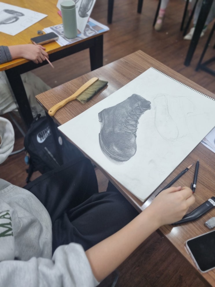 1월 8일(목) 수업 기록 초등반 -겨울을 주제로 한 인물 표현 수업을 진행했습니다. 겨울 소품과 색을 활용해 각자 생각하는 겨울 모습을 그림으로 완성했습니다. -유리컵 소묘진행중 “진한 건 ‘어두운 느낌’이 아니라 ‘유리가 겹친 표시’야.” 고등반 군화 소묘 수업을 진행했습니다. 형태 관찰과 명암 표현에 집중하며, 재질감과 구조를 차분하게 표현하는 연습을 했습니다. “군화는 예쁘게 그리는 게 아니라 단단하게 그리는 거야.” 짧지만 각자 수준에 맞게 집중도 있는 수업이 이루어진 하루였습니다 고등학생언니 기초수업 ☆수업시간 오후 2시 ~ 6시30분 (60분 수업) 주 1회 ~ 3회 수업 ☆ 수업연령 유치부(5세~) 초등부 중등....... <img src="https://blogthumb.pstatic.net/MjAyNjAxMDlfMjMx/MDAxNzY3ODkwODYxODQ2.uFwoHpW9cQVqtXVcOQ3q0MNtE0IumK843YMwzDgfOysg.Td1ki3UeGAsYj-Qk9coQhHmQTPUGma0uKQp3Gv9Br6cg.JPEG/900%A3%DF20260108%A3%DF154909.jpg?type=s3" />