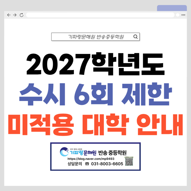 안녕하세요 기파랑문해원 반송중등학원입니다! 오늘은 2027학년도 사관학교/경찰대학 수시 6회 제한 미적용에 대해 알려드리겠습니다. 인천광역시 교육청에서 발표한 <2027 대입전형 미리보기> 에서는 일부 대학의 2027학년도 신입학전형계획(안)을 정리하여 발표하였는데요, 오늘은 그 중에서도 수시 6회 제한 미적용 대학들에는 어디가 있는지 알아보겠습니다! 대학입학지원방법 수시모집 이전 포스트 <2027학년도 대입전형 모집시기/지원방법> 에서는 수시 모집의 경우 지원 가능한 횟수를 최대 6회로 제한한다는 것을 알려드렸는데요! 그런데! 이 수시 6회 제한을 적용받지 않는 대학들이 존재한다는 점, 알고 계셨나요? 이 대학....... <img src="https://blogthumb.pstatic.net/MjAyNjA0MDRfMTQ5/MDAxNzc1MjgyNDM0NzYz.HiH_79utLoKZbxvrtxLeErNnUN_WOKKMnTn6jzkeuEsg.v-0fK-WctMy6Kceiv3ifkMgXjGACsqtQKhzxFxQ2negg.PNG/260322%BA%ED%B7%CE%B1%D7%C7%A5%C1%F6_%2810%29.png?type=s3" />