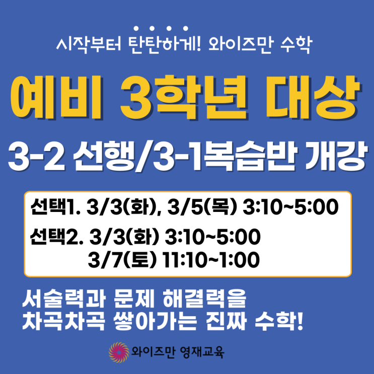 안녕하세요 와이즈만 영재교육 분당센터 입니다. 초등 3학년 고민 많은 시기 입니다. 저학년을 벗어나 고학년으로 진입하는 단계이고 수학에서 이른바 '첫 번째 고비'라고 불리는 시기입니다. 분수와 나눗셈 등 추상적인 개념이 등장하며 단순 계산만으로는 더 이상 상위권 유지가 어렵기 때문입니다. 이에 와이즈만은 3월부터 3학년 수학 서술 및 최상위(복습반)을 추가 개설하여 아이들의 수학실력을 더 탄탄하게 쌓아가고자 합니다 왜 지금 '수학 서술력'인가? 많은 학부모님들께서 "초등학생이 벌써 입시를 고민해야 하나요?" 라고 묻습니다. 하지만 최근 변화된 입시 환경은 "초등 시기의 서술 습관&quo....... <img src="https://blogthumb.pstatic.net/MjAyNjAyMDZfMTA5/MDAxNzcwMzcyMTA0MDM0.2bMN-PDZ2KLaWwjK6eAGw2m1KZEq2xaN_WOpgDx03fwg.iqb5P6bFIRDrSZVrpRbpmBWyMndp4LZMwU2ehpXvtKkg.PNG/%C1%A6%B8%F1%C0%BB-%C0%D4%B7%C2%C7%D8%C1%D6%BC%BC%BF%E4__%BA%B9%BB%E7%BA%BB-001.png?type=s3" />