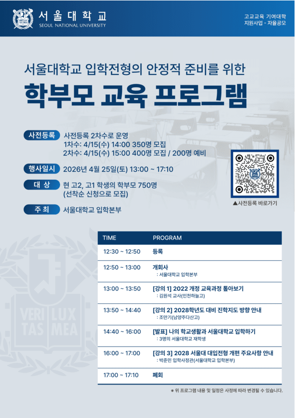 -현 고1,2 학부모 대상 2022 개정 교육과정, 2028 대입 지도 방향 안내 서울대학교 입학본부가 현 고1,2 학년 학부모를 대상으로 한 ‘학부모 교육 프로그램’을 오는 4월 25일 온라인 실시간 생중계 방식으로 개최합니다. 이번 행사는 2022 개정 교육과정과 2028학년도 대입 변화에 대한 이해를 돕고, 안정적인 입시 준비 방향을 제시하기 위해 마련되었습니다. 특히, 기존보다 참여 인원을 확대해 총 750명의 학부모가 수강할 수 있도록 운영됩니다. "현 고1,2 학부모 750명 대상 온라인 생중계 진행” 이번 행사는 직접적으로는 서울대 입학전형을 준비하는 학부모들에게 정확한 가이드라인을 제공하기 위해 마련된 행사이지만, 달라진 2....... <img src="https://blogthumb.pstatic.net/MjAyNjA0MDdfMTkw/MDAxNzc1NTY1NzUyNDUw.bES1PYA5EpR6EvDzvfXVDM0qU9B4C4NLldpY2V8cd0wg.H6SWz8pfuyIR7fyTfR-wSa6Lk-OzXe3_5tJgWLBIk88g.PNG/%BC%AD%BF%EF%B4%EB_%C7%D0%BA%CE%B8%F0_%B1%B3%C0%B0.png?type=s3" />