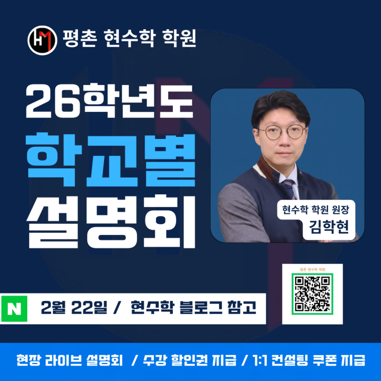 안녕하세요. 평촌 학원가에서 15년째 학생들의 수학과 입시를 책임지는 평촌수학학원 현수학 학원 원장 평촌입시김쌤 입니다. 중학교 졸업과 고등학교 입학 사이의 그 묘한 설렘과 불안함이 공존하는 시기입니다. 특히 이번 2026년 고1 학생들은 고교학점제의 본격적인 적용과 변화된 입시제도의 흐름 속에 있어 학부모님들의 걱정이 여느 때보다 크실 거라 생각합니다. 그래서 준비했습니다. 평촌 지역 고등학교들의 특성을 꿰뚫고 있는 평촌입시김쌤인 제가 우리 아이들의 3년을 결정지을 핵심 전략을 공개합니다. 2026학년도 고등학교1학년 학교별 맞춤 설명회 안내 이번 설명회는 일반적인 입시 설명회가 아닙니다. 내가 갈 학교의 고등학교....... <img src="https://blogthumb.pstatic.net/MjAyNjAyMDRfMjYz/MDAxNzcwMTg2MjkxMjMw.g88RxL4QMKcHfs0iJ9vD_o6qi_D_RUvdXX8EL0NY454g.qq8ViWllqF0c3xH8MTqbbr8qsRpVZ-91RUggt8nKu1og.PNG/%C1%A6%B8%F1_%C3%DF%B0%A1_%281%29.png?type=s3" />