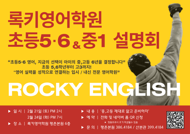 영어성적, 록키를 믿으세요! 『록키영어학원』 학부모는 압니다 "영어, 가장 잘~ 가르치는" 안양 평촌 & 군포 산본 NO.1 초·중·고 입시/내신 영어전문학원 안녕하세요 『록키영어학원』 원장 박재홍 입니다 최근 “요즘 아이들, 영어 수준이 예전과 다르다”는 각종 뉴스를 저도 자주 접합니다 하지만 이 겉으로 드러난 실력 뒤에는, 초등학교 때부터 쌓아 온 영어 습관이 고3 수능 1등급을 사실상 결정짓는다는 냉정한 현실이 숨겨져 있습니다 록키영어학원은 이달 설명회를 통해 지금 우리 아이가 배우는 영어가 어떻게 고3 수능과 대입까지 이어지는지, 처음부터 끝까지 한 장의 로드맵으로 보여드리려 합니다 [ROCKY 영어] 입....... <img src="https://blogthumb.pstatic.net/MjAyNjAyMTBfMjA2/MDAxNzcwNjk3NDAyNzc4.HFQzucZBgF8hePypql7UE4ThaHMeOPeDJn4jTErVEY4g.NYhZlxI98x0pBKmivn7gIt90XU8JSBOJ1oQQOn_LVmAg.PNG/KakaoTalk_20260210_121510492.png?type=s3" />