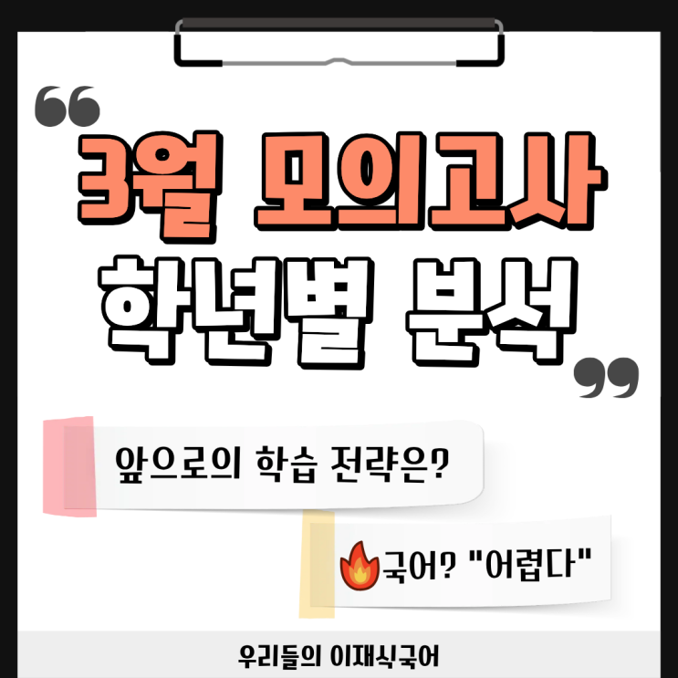 안녕하세요. 우리들의 이재식국어입니다! 지난 24일 고등학생 친구들은 3월 학력평가를 봤습니다. 모두 고생 많았어요~ 3월 학력평가는 연초 학습 성과를 점검하고 수능 대비 방향을 설정하는 출발점이 되는 만큼 매우 중요합니다! 그래서, 이번 학력평가를 통해 우리 친구들이 앞으로 어떤 점을 보완해야 할지, 확실히 확인할 수 있도록 종합 총평을 준비했습니다:) 이재식국어학원 재원생 성적 공개 3월 모의고사 이재식국어학원 재원생들의 성적을 공개합니다! 아직 성적 취합이 진행 중이지만, 현재 확인 결과 2등급 이상 성적우수자 196명 우리 친구들이 정말 자랑스러워요! 모두들 고생 많았습니다. ^^ 이번 시험을 통해 올바른 학습 방향....... <img src="https://blogthumb.pstatic.net/MjAyNjAzMjlfMjQg/MDAxNzc0Nzc3MTA1ODk2.kpaccH_J48vb76ulTMLbwPsJP1cNtsPQj11XGmQeMvkg.hvB3ey398de_Q1enKwLW7b8ZKjOH4MAWifcL1jegHbEg.PNG/1.png?type=s3" />