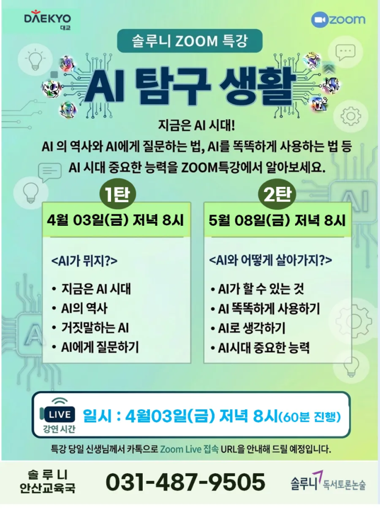 솔루니 ZOOM 특강 1탄 주제: AI 탐구 생활 (AI가 뭐지?) 일시: 4월 3일(금) 저녁 8시 (60분) 이번 특강에서는 AI의 개념과 역사, AI에게 질문하는 방법 등 아이들이 꼭 알아야 할 AI 기초 내용을 다룹니다. ✔ 주요 내용 지금은 AI 시대 AI의 역사 거짓말하는 AI AI에게 질문하기 특강 당일 카톡으로 ZOOM 접속 링크 안내드릴 예정입니다. <img src="https://blogthumb.pstatic.net/MjAyNjA0MDJfMTA3/MDAxNzc1MDkwNzA4MTUw.rrXuSRQp0SKIxza-XwmBzbCjGEWKAz2-FLyZl0AooQ0g.vs2GoTK8Nx7qYt2XLoYXLf3MQDFPQF4dR3cF2SlOko0g.PNG/900%A3%DF1774507055538.png?type=s3" />
