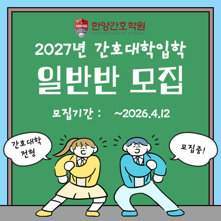 2027년 간호대학 입학 일반반 모집 대상자 : 고등학교 이상 졸업자 모집기간: 2026년 4월12일까지 교육일정 2026년 4월13일 ~ 2027년 2월26일 간호대학교 입학예정 2027년도 문의: 031-408-9535 <img src="https://blogthumb.pstatic.net/MjAyNjAzMjBfNTgg/MDAxNzczOTk3NDY3NDUy.tTLAcS2L1ojmdJwYyLDqHGag2AiDQFUiXi7HSsNsDUkg.NUtyl549fN-RO7pKafexodXVKzaQnzg_szwAAN-0J28g.JPEG/1.jpg?type=s3" />