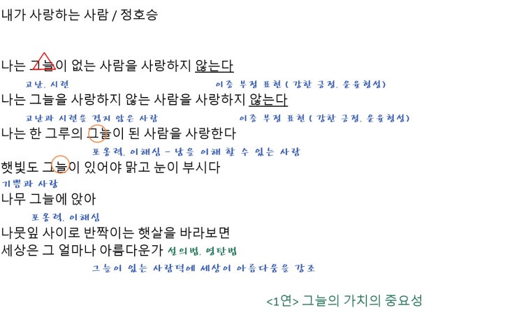 안녕하세요. 진학원입니다. 오늘은 부곡고1 공통국어1 천재 교과서의 '내가 사랑하는 사람' 공부해보도록 하겠습니다. ※ 주제 : 타인의 시련과 고난에 대한 공감과 연민 ※ 특징 - 유사한 통사 궂의 반복을 통해서 운율을 형성하고 의미를 강조함. - 대조적 시어를 활용하여 주제를 역설적으로 드러냄. - 이중 부정을 통해서 강한 의미를 전달하고 운율을 형성함. 교육상담 1644-0735 <img src="https://blogthumb.pstatic.net/MjAyNjAzMjZfODQg/MDAxNzc0NTI2ODg4OTcw.vYXa6OH6a10fhNLJ8TILmfKZBviWZgohAEvlvvJ6CS0g.ZyQCocX6WDfVwtvtq9WT42KqrbrVI4Asx2jX3B3DTwog.JPEG/1.jpg?type=s3" />