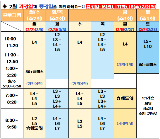 [남양주 호평동 성인 영어회화 전문학원 프렌즈어학원] 2월 시간표↓↓ 기초레벨인 L1은 모든 시간에 현재 대기를 받고 있는 중이니 참고해주세용~~ :) 쉐도잉 수업은 주 1회 진행 되어요! 50+클래스를 오픈 했어요! 편하게 문의 주세요! :) 시간표에는 없지만 [월/수 5시30분]에도 수업 진행 예정입니다~! 10단계 레벨이 있기 때문에 시간표는 참고만 하시고, 정확한 확인을 위해 레벨테스트(5분 정도 소요)를 받아주세요 맞는 레벨에 들어가는 것은 무척 중요합니다! (아래 카카오톡을 이용해서 방문예약을 해 주세요~!) 단, 레벨1이 아닌 분들은 언제라도 Join하실 수 있어요! 카카오톡 문의는 아래 링크를 클릭해 주세요! :) ▼▼▼ https://....... <img src="https://blogthumb.pstatic.net/MjAyNjAxMzBfMTAx/MDAxNzY5NzMwNzQ2Njg4.Xkk-V2yqxPnHtgg0MMcwsB0S3i9fhodyzdGukHqrfaog.0GP-PZ_s1j3G_dOzE-LyQorPqtPKBk_H65NG777pFZQg.PNG/2%BF%F9_%BD%C3%B0%A3%C7%A5.png?type=s3" />