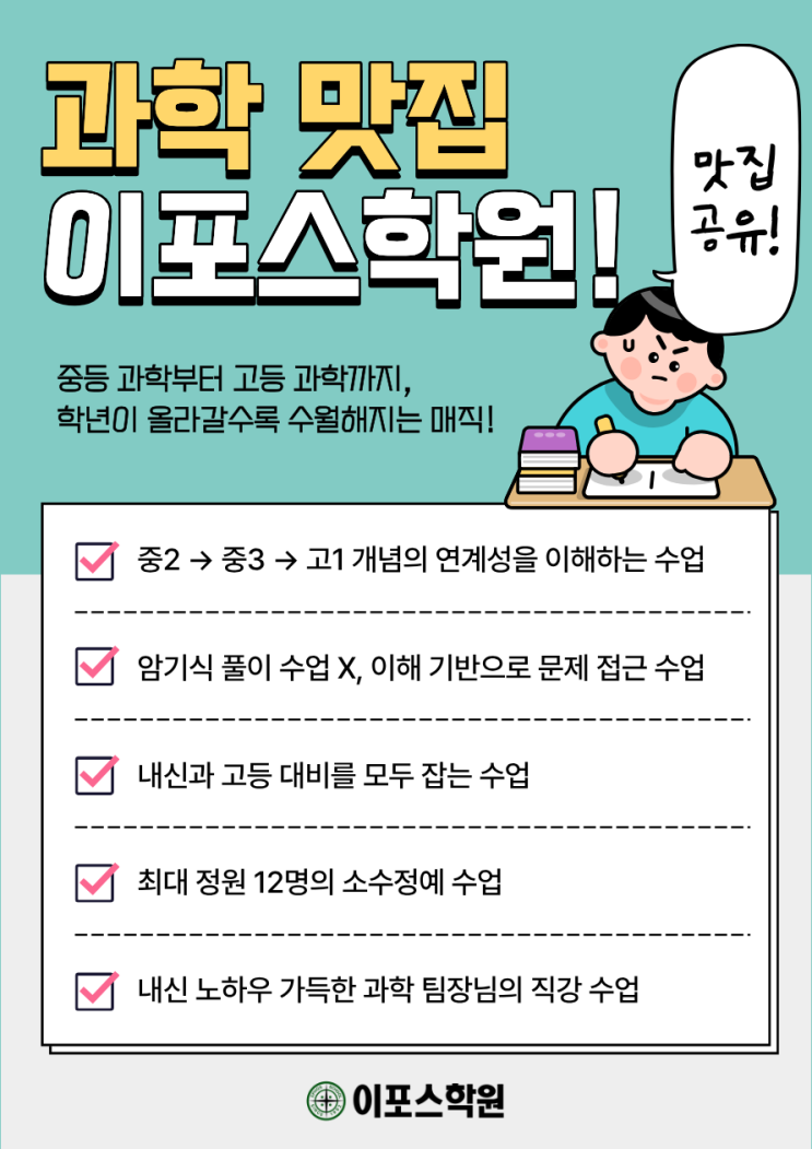 안녕하세요, 초등/중등/고등 수학 과학 전문학원, 이포스학원입니다! “과학은 시간 될 때, 나중에 해도 되지 않나요?” “고등학교 올라가서 제대로 하면 되지 않을까요?” 과학은 수학과 영어에 비해 비교적 우선순위가 밀리는 과목입니다. 하지만 꼭 기억해야 하는 것은 과학은 ‘나중에 한 번에 정리하기 어려운 과목’이라는 것입니다. 그 이유는 현 학년에서 학습하는 단원들이 학년을 올라가면서 연계되기 때문입니다! 중2 1학기 - 과학이 ‘암기 과목’에서 ‘이해 과목’으로 바뀌는 시기 중2 1학기에는 ✔ 물질의 특성 ✔ 지권의 변화 ✔ 빛과 파동 ✔ 물질의 구성 을 배우게 됩니다. 이 시기부터 계산이 등장하고 그래프를 해석....... <img src="https://blogthumb.pstatic.net/MjAyNjAyMDVfMjkg/MDAxNzcwMjY5MjAzODMz.Wvahsq1OTUgxLL0AVMCfNck5xilQYvUIkpwN7JGAffQg.n7scb6_noAU29XAWJnVwZYeIFpgYFDGjxJFnNan-7eog.PNG/%C1%A6%B8%F1%C0%BB_%C0%D4%B7%C2%C7%D8%C1%D6%BC%BC%BF%E4..png?type=s3" />